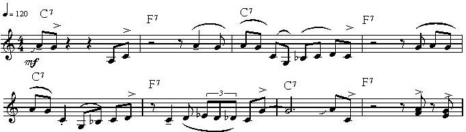 Line-up: 2 Altos, 2 Tenors, Baritone, 4 Tpts, 4 Tbns, 3-4 rhythm section. Tbn2 solos. A pun on sexual relations. Difficult split ensemble passage - will need some rehearsing. I used horns instead of trumpets on the recording as the trumpet sound on the software is dreadful. Here is a snippet of the tune.